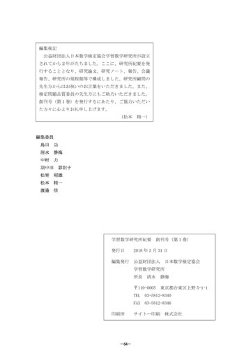 学習数学研究所 所長 清水 静海(*) 平成 11 年 7 月文部科学省の認可を受けて財団法人日本数学検定協会が発足しました。この 法人の目的の一つに「学習数学の体系的研究を推進する」ことがあり、そのため、平成 13 年 学習数学研究所を設立し、同年には文部科学省より科学研究費補助金取扱規程で定められた研 究機関に指定されました。しかし、諸般の事情により平成 22 年 6 月学習数学研究所をやむを 得ず閉じることとしました。 平成 25 年 10 月、財団法人日本数学検定協会は財団法人から公益財団法人に法人格を移行 し、 「当協会における研究の基盤を担い、実用数学技能検定(数学検定・算数検定)を中心と する研究及び調査を行い、数学の生涯学習の進歩発展に寄与する」ことを目的として、平成 28 年 2 月学習数学研究所(以下、単に研究所とする。)を設立しました。研究所の主要な事業 は、①数学の生涯学習に関する研究の実施、②検定に関する研究の実施、③算数教育及び数学 教育に関する研究の実施、④研究会・講演会等の開催、⑤紀要の刊行等です。これらの事業に は、研究所員はじめ、協会員ならびに研究所をお支えいただいています幼小中高大学の教員を 中心に構成されたシンクタンクの皆様に深くかかわっていただき、多くの方々のご支援により 展開されています。 この度、公益に資する活動を展開する一貫として、研究所の研究や活動等について取りまと め、紀要として公にし、情報を共有することとなりました。研究所設立後、平成 30 年 3 月ま でのおよそ 2 年間に、研究部門で実施した「数学の生涯学習」 、 「検定結果の分析」 、 「コンテン ツの開発」に関する研究の内容を論文等記事にまとめるとともに、運営部門、検定問題品質管 理部門の活動に関する内容も掲載することとしました。 学習指導要領が改訂され、小学校では2020年度から、中学校では2021年度からそれぞれ完全 実施され、高等学校では2022年から学年進行で実施されることになっています。育成を目指す 資質・能力が「知識及び技能」、「思考力,判断力,表現力等」、「学びに向かう力,人間性 等」の三つの柱に基づいて整理され、自立と協働による創造を支え、価値ある新たなものを生 み出すものとして働くようにし、「人間ならではの強み」を明らかにし、それを活かすことを 中核においた教育が実施されようとしています。算数や数学の学びを通して育まれた資質・能 力は、こうした方向を基盤として支えることができると確信しています。 紀要の創刊を機に、生涯学習及び算数・数学教育に関する研究活動をさらに進めて、将来に 渡って有用な情報を発信し、社会に貢献できる体制を整えてまいります。また、当協会の一松 信名誉会長、甘利俊一会長、合原一幸理事から紀要の創刊に寄せてお祝辞をいただきました。 皆様からのご期待を今後の活動の励みとして精進してまいります。皆様からのご指導、ご鞭 撻、引き続き宜しくお願いします。