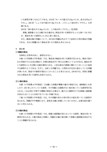 - いた誤答が多くなるようである。270 回「ホースの重さが2kg のとき、長さは何mで すか。 」 、265 回「しょうゆの重さが 3kg のとき、このしょう油は何 L ですか。 」も同 様である。 258 回「油の重さが 3/4kg のとき、この油は何 L ですか。 」 (包含除) 除数、 被除数ともに分数である場合は、 除法を用いた誤答がもっとも多い (19.3%) が、乗法を用いた誤答も 11.5%と多く現れる。 また、調査対象の問題について、253 回の問題以外はすべて直前の小問が乗法の問題 である。それに影響されて乗法を用いた可能性も考えられる。 4 まとめ (1)整数の除法 全体的に正答率が高く、誤答は少ない。 9級(小学校第3学年程度)では、乗法及び減法を用いた誤答が見られる。乗法で書か れた答案の中には式は乗法で、 計算は除法を行い答えは正解というものがある。 減法を用 いる誤答は 11 月以降には減る傾向にある。上記は新出の演算に慣れていないことに起因 する誤答のようである。ただし、分析した問題では、小問同士が完全に独立している問題 が多いため、除法での誤答が現れにくかったことも考えられる。239 回では、前問に影響 された除法を用いた誤答も見受けられた。 (2)小数の除法 8級(小学校第4学年程度)で出題した除数が整数の場合の除法では、被除数を 10 倍 したり 100 倍したりしている誤答、その問題とは関係がない値を使っている誤答等が見 られる。 これ以前に学習する整数の除法とは異なり、 数の大小関係だけでは除数と被除数 が決まらないことに対処できていない印象である。 7級(小学校第5学年程度)では、その問題の前の小問の答えの値を用いている誤答が 見られる。問題がやや複雑になり、意味を正確に把握していないために、必要な値を選べ ないと考えられる。 (3)分数の除法 6級(小学校第6学年程度)では、除数と被除数が逆になっている誤答、乗法を用いた 誤答が見られる。 小数の除法と同様に、 問題を正確に読み解いて除数と被除数を決定する ことに課題が見られる。