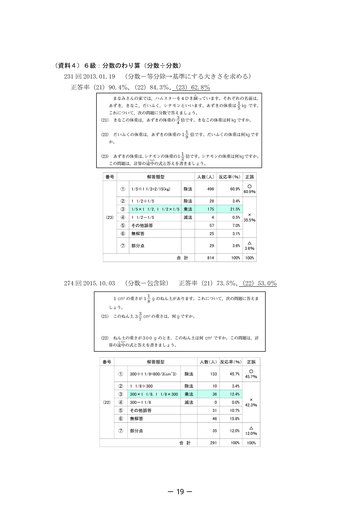 - ・除数は正しいが、被除数に問題文の他の数値を用いている(解答類型④) 。 調査対象の問題はどれも小問が3問ある中での2問めないし3問めの問題であ り、調査対象の問題とは関係のない数値も提示されている。問題を解くために必要 な情報を正しく選べなかったことに起因すると考えられる。 (3)7級:分数のわり算(分数÷整数) (資料3) 7級の調査対象となり得る問題は 239 回の1問(小問番号(24) )だけであった。この 問題が基準にする大きさを求める問題であったためか、他の問題とは異なる傾向が見ら れた。 ・ 「その他誤答」が 30%を占める(解答類型④) 。 「その他誤答」 の中に、 小問番号 (22) で求めた答えを用いた答案が 11.1%、 (23) で求めた答えを用いた答案が 2.8%と多く見られた。 これらの誤答は、 (24) が (22) 、 (23)とは独立した問題であることを読み取れていないことを示している。 ・無解答が 14.3%と多い(解答類型⑤) 。 「無解答」 が多いことから、 問題文の意味を読み取れていないことが考えられる。 リンゴの重さが分数で表されているので、状況を実感できなかった可能性がある。 (4)6級:分数のわり算(分数÷分数) (資料4) 231 回は等分除の問題で、基準にする大きさを求める問題であった。253 回は包含除の 問題で何倍にあたるか(割合)を求める問題であった。他は標準的な包含除の問題であっ た。 ・除法を用いている誤答が多い場合(除数と被除数が逆) (解答類型②) 258 回「油の重さが 3/4kg のとき、この油は何 L ですか。 」 (包含除) 除数、 被除数ともに分数である場合である。 包含除の意味を正しく理解していない と考えられる。 253 回「5/6kg は 7/12kg の何倍の重さですか。 」 (包含除-何倍であるか(割合)を求 める) この問題の誤答の多くが除法を用いた誤りである。何倍かを求めるので除法を用 いることは理解しているが、2数がともに分数であるため、除数(基準量)の決定を 誤ったと考えられる。 ・乗法を用いている誤答が多い場合(解答類型③) 231 回「あずきの体重は、シナモンの体重の 1 1/2 倍です。シナモンの体重は何 kg ですか。 」 (等分除-基準にする大きさを求める) 「1 1/2 倍」というところから、よく考えずに乗法を用いたものと考えられる。 274 回「ねん土の重さが 300gのとき、このねん土は何 cm3 ですか。 」 (包含除) 整数値を用いる場合、除法を用いた(除数と被除数を逆にした)誤答より乗法を用