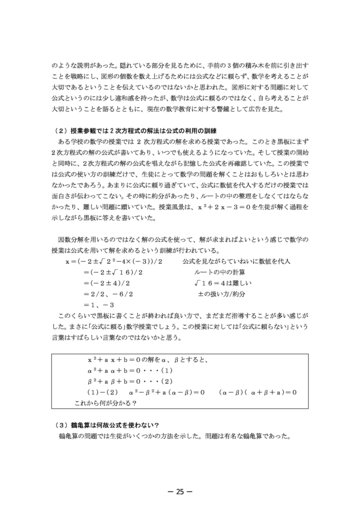 個々の学びの改善に向けた数学検定・算数検定への期待……………………………… 塩澤 友樹 3 【研究論文】 高校理科における数学活用調査………………………………………………………… 中村 力 除法を使って解く問題に見られる誤答 -算数検定の記述式問題の答案の分析を通して-……………………………… 松本 精一 9 数検答案から見た数学教育の問題点 -公式に頼る数学教育から数学を楽しむ数学検定へ-………………………… 【研究ノート】 2次行列の累乗について………………………………………………………………… 一松 信 直線上の点 E で AEn+BEnを最小とする点 E の位置変化……………………………… 渡辺 信 29 33 渡辺 信 22 4