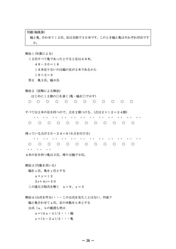 1.方程式の「解」 方程式の根 root が解に変わった段階から用語の解釈が変わった。この問題はもう解決済 みなのかもしれないが確認をしたい。 2 次方程式 (x-1)2=0 の解は x=1 である。 以前はこの根x=1は重根として 2 個と数えた 代数学の基本定理である 「n次方程式の解はn個」 に対して、2 次方程式 (x-1)2=0 の 解は x=1 の 1 個は言葉の上で問題があるのではないかと思う。 数学検定では回答は「2 次方程式 (x-1)2=0 の解は x=1 である」を用いている。 この問題と似てくることが「接点」の扱いではないか。 (1) 円の接線の定義は半径と直交する点であるならば1点である。 割線と円との交点2点が限りなく近づく点としたときには2点が存在する。 (2) 曲線に対する接線を考えるときは、 (a.f(a))と (a+h.f(a+h))の2点の平均変 化率 このときも2点を考えている。 (3) x軸上での接点はこの点を2回通るとしたときに意味があう。 二つの曲線の「共有点」と言う言葉によって接点は1個と数えている。 判別式 D=0のとき の共有点は1点である。次の問題では共有点をどのように数えるのか? y=x3-3xとy=cとの交点の個数 c<-1のとき c=-1のとき c=1のとき 1<cのとき 2.積分定数の効用・必要性 積分の計算問題では積分定数 C を付けることになっている。不定積分であるから当然で あるが、定積分になると、計算上で入らない。この C を重視している感じがあるが、どの ように考えているのであろうか。積分定数を付けない解答の扱いは? 例えば速度 v=4で歩いたときにs=4t+cの直線群が解になるが、 初期条件が付く問 題のほうが応用的ではないか。応用するときには積分定数が必要になってくる。 また、三角関数などの答えの表現にはいろいろな表現があるので、C は必要かもしれない。 積分定数 C を必ず付けることを強調していく必要性はあるか。 (渡辺信) 1個 2個 2個 1個