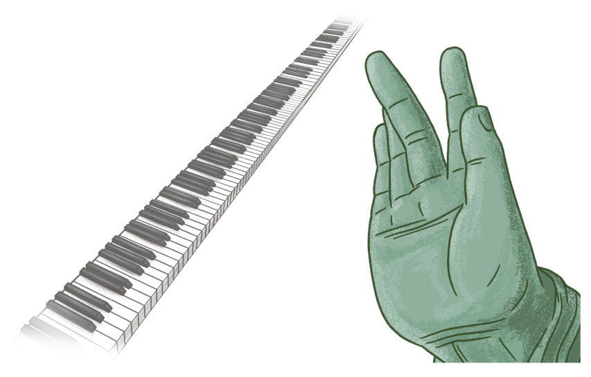 もし、大仏さまがピアノを弾く場合、右手は最大で何オクターブまで届くと考えられますか。