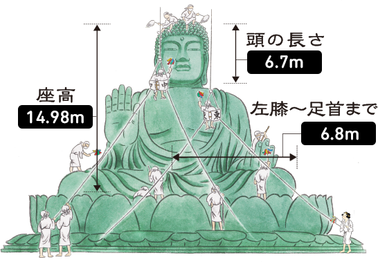 大仏さまについて、いろいろな部位の寸法を細かく調べ、かつ形状をわかりやすく単純化しており、表面積を求める過程に誠実さが感じられます。さらに、ゴンドラを支えること、遠くから指示をすることといった役割を考慮して奉仕者の人数を割り出しており、その現実性の高さを評価しました。