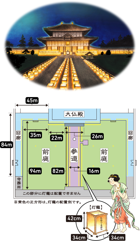 灯籠や大仏さまの見え方、準備や片付けの仕方、安全な実施などを考慮し、現実的で審美的な灯籠の配置を考えましょう。