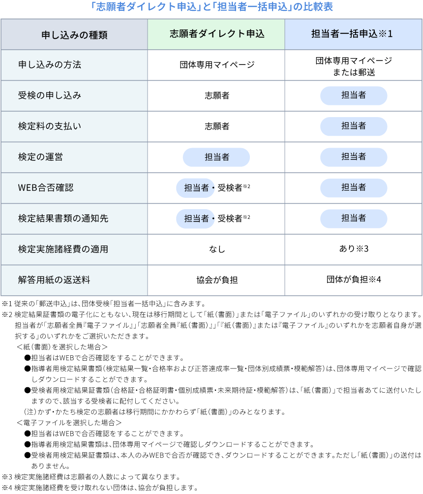 団体受検の申し込みは「志願者ダイレクト申込」と「担当者一括申込」の2種類があります。