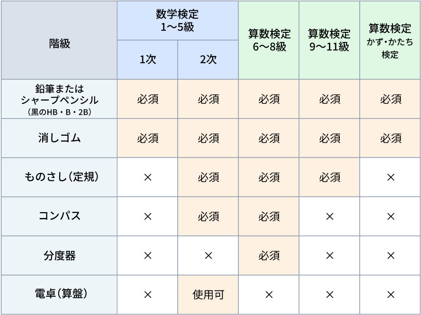 ●準1~5級の2次:数理技能検定で電卓(算盤)の使用が認められること。使用できる電卓の種類は、一般的な電卓・関数電卓・グラフ電卓。通信機能や印刷機能をもつもの、携帯電話・スマートフォン・電子辞書・パソコンなどの電卓機能は使用できない。