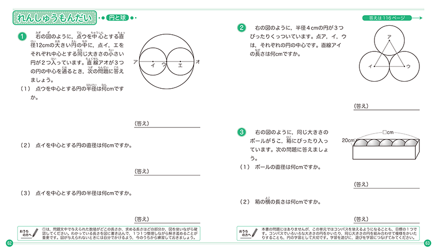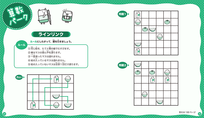 キャラクターのアドバイスを読みながら、親子で楽しく算数を学べる学習書です。単元ごとの重要な学習ポイントと、解説、例題、練習問題を掲載しています。